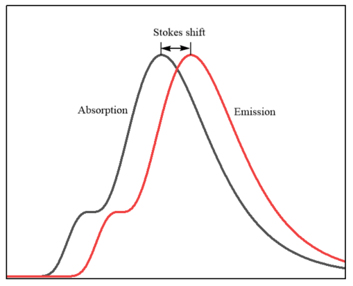 例子: 物质吸收了高能的紫外线(不可见),发出的却是低能的绿光或红光(可见)。这种激发波长与发射波长之间的波长差被称为斯托克斯位移。