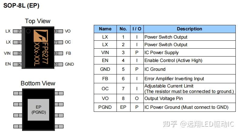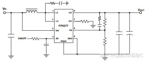 这是一款带限流引脚的芯片,OC为它的限流引脚,内置软启动保护,恒定的开关频率为500 kHz,并采用脉宽调制(PWM)工作,内置的30mΩ高侧开关和30mΩ低侧开关提供了一个高效的转换,待机状态下静态电流100uA,关断电流小于1uA,FP6277具有过温保护、过压保护、过流保护。