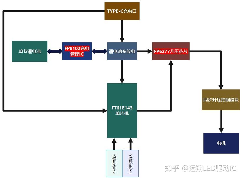 它主要由电机、刀头、电路板、锂电池组成,其中起主导作用的在于电路板,这块电路板上包含了电推剪能够大功率运行的所有电路,其中包括我们的升压芯片FP6277,以及单片机FT61E143,充电管理IC FP8102,TYPE-C充电口以及LED灯珠。