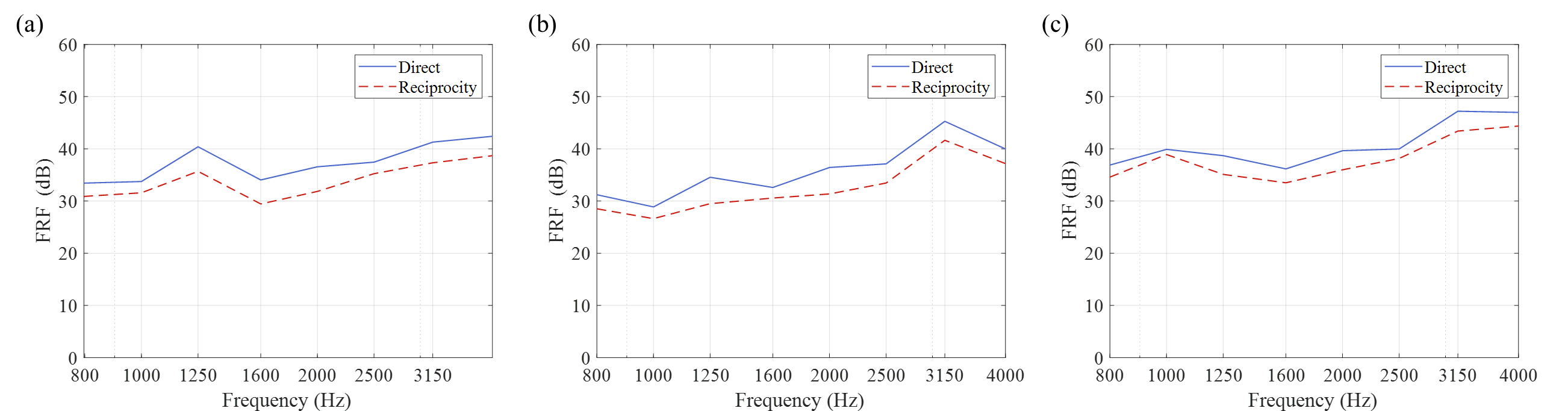 ATA-2082高压放大器可有效驱动压电型水下声源,水下声压和壳体振动响应明显,相较背景噪声高20dB以上,保障了数据的有效性。通过互易方法所测试的三分之一倍频程频响函数与直接测试结果,幅值相近、趋势一致,证明了采用互易方法测试水下航行器频响函数的有效性。