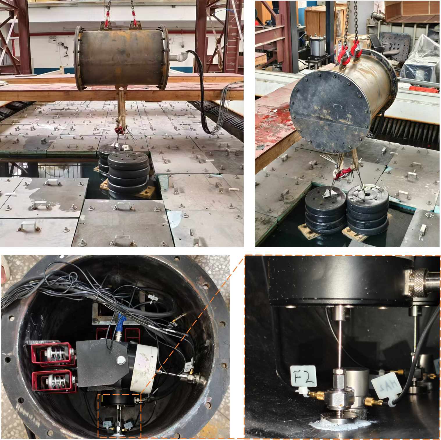实验内容:水下航行器在运行过程中,其壳体内部机械设备运转产生的水下声辐射会对航行器的声隐身性能造成显著影响。采用频响函数能够准确评估壳体内部不同位置处机械设备的声辐射贡献程度。然而,由于设备间存在声振耦合效应,且壳体内部空间狭小、实验设备布置困难,频响函数的直接测量往往难以开展。本研究旨在通过声学互易方法测试水下航行器壳体的频响函数,并评估其内部不同位置设备的声辐射贡献度。实验在消声水池中进行,采用带端板的圆柱壳结构模拟实际航行器壳体,以克服内部空间狭小、设备布置困难及声振耦合效应导致的直接测量障碍。