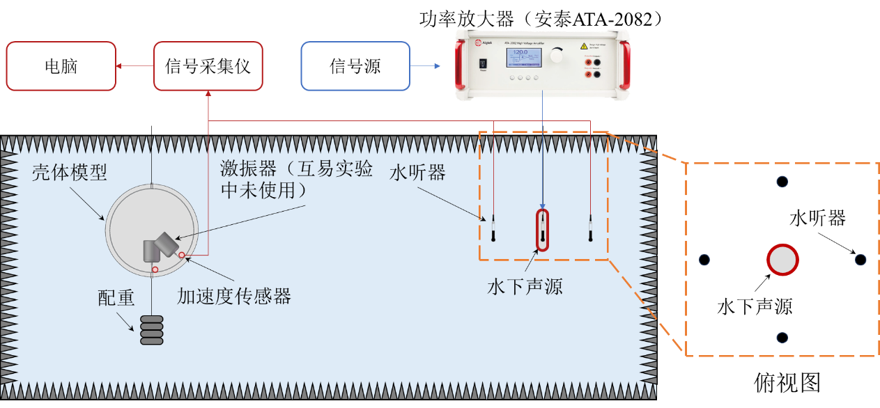 测试设备:信号源、ATA-2082高压放大器、水下声源、水听器、加速度传感器、信号采集仪等。