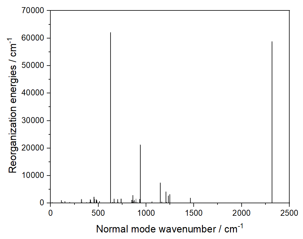 通过频率计算,可以获得基态/激发态的正则坐标,而激发/发射之后分子的位移ΔQ可以分解为这些坐标的贡献。如下图。