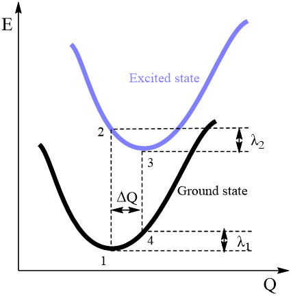 如图横坐标代表分子坐标,纵坐标代表能量,则激发态和基态的势能面如上图两条曲线所示。由重组能的定义,我们可以知道基态到激发态的激发过程结构弛豫的重组能Eλ2=E2-E3,而从激发态回到基态的发射过程的结构弛豫的重组能Eλ1=E4-E1。