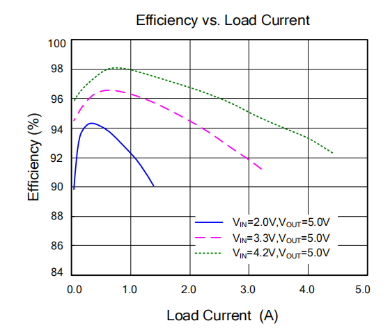 (1)采用极低导通电阻MOSFET,在5.0V输出条件下,主开关NMOS内阻仅为20mΩ,同步开关PMOS内阻仅为40mΩ,大幅降低导通损耗。