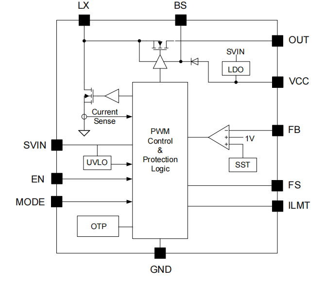 (1)超低导通电阻(10mΩ)的主开关N-FET (2)超低导通电阻(20mΩ)的同步整流N-FET (3)自适应恒定关断时间与电流模式控制核心 (4)PFM/PWM轻载运行模式智能选择模块 (5)高度集成的内部环路补偿网络 (6)精准的可编程峰值限流与频率发生器 (7)限制瞬态开机浪涌的内部软启动模块