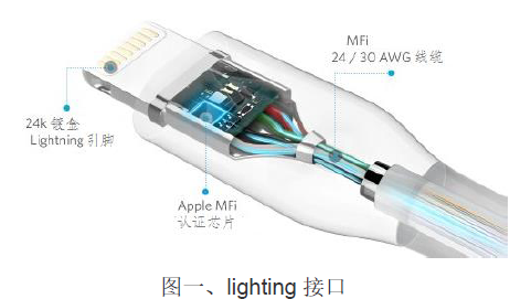 专为苹果手机、ipod 和 ipad 定制的 lightning 接口是苹果的专利接口,中文可将其译为”闪电”接口。淘汰了老式 30pin,集成数据充电一条线,结实耐用,lightning 接口两侧各有8Pin 触点,白色的部分让这些针脚相互绝缘。如图一所示,最外层的金属实际上起到的是接地功能,因此严格的说 Lightning 接口采用的是 9Pin 针脚设计。接头的两边各有一点点凹进去的地方,这个主要是为了能够紧紧的卡在插槽中(插槽内部左右两边各有一个弹簧片)。金属部分会首先进入插槽,避免了信号针先连接造成静电干扰。插头不分正反面,无论怎么插入都可以正常工作。