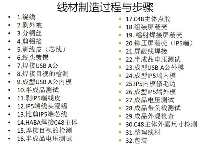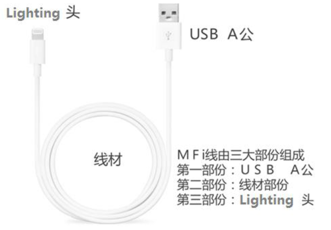 Lightning 数据线主要有三部分组成:USB 插头、线材、Lightning 插头。生产一根MFi 数据线其实并非我们想象中那么简单,在得到苹果的 MFi 认证之后,就开始生产了。生产一根 Lightning 数据线,一共有 32 道工序,需要 45 个工人的流水线才能做出来。