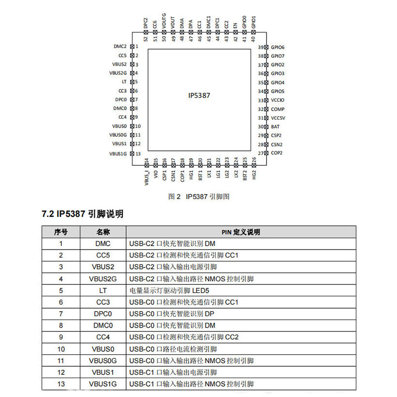 为适应不同设备和应用场景,IP5387支持多个USB接口。包括VBUS0、VBUS1、VBUS2,这些接口既支持USB-C输入输出,也支持USB-A输出;另有VOUT接口,支持USB-C线缆输出或USB-A输出。各个接口均支持快充功能,用户在使用时无需区分特定快充接口,为手机、平板电脑等设备充电均可实现快速充电。