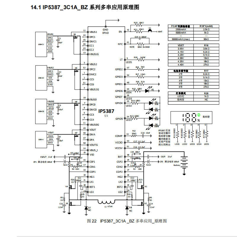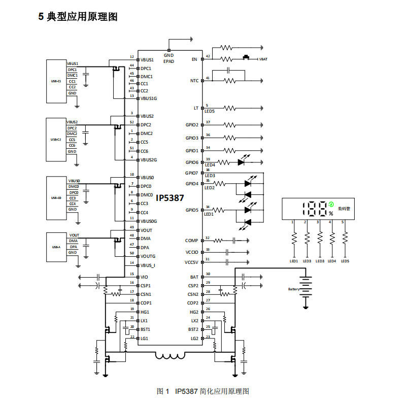 IP5387集成了1路双向升降压PWM控制驱动和4路路径NMOS控制驱动,有助于简化电路设计,提高系统稳定性和可靠性。在电量显示方面,内置14bit ADC和库伦电量计,支持1灯、2灯、4灯LED电量显示以及188数码管电量显示,并支持电池容量PIN选,可帮助用户了解移动电源的剩余电量。