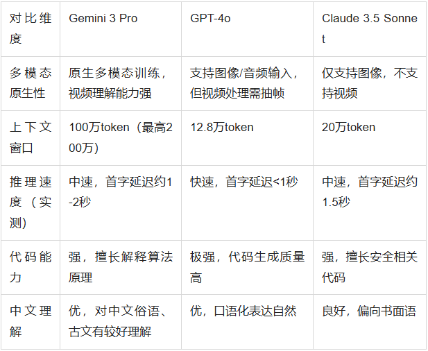 为帮助读者更直观理解Gemini的技术定位,我们将三款顶级模型进行横向对比: