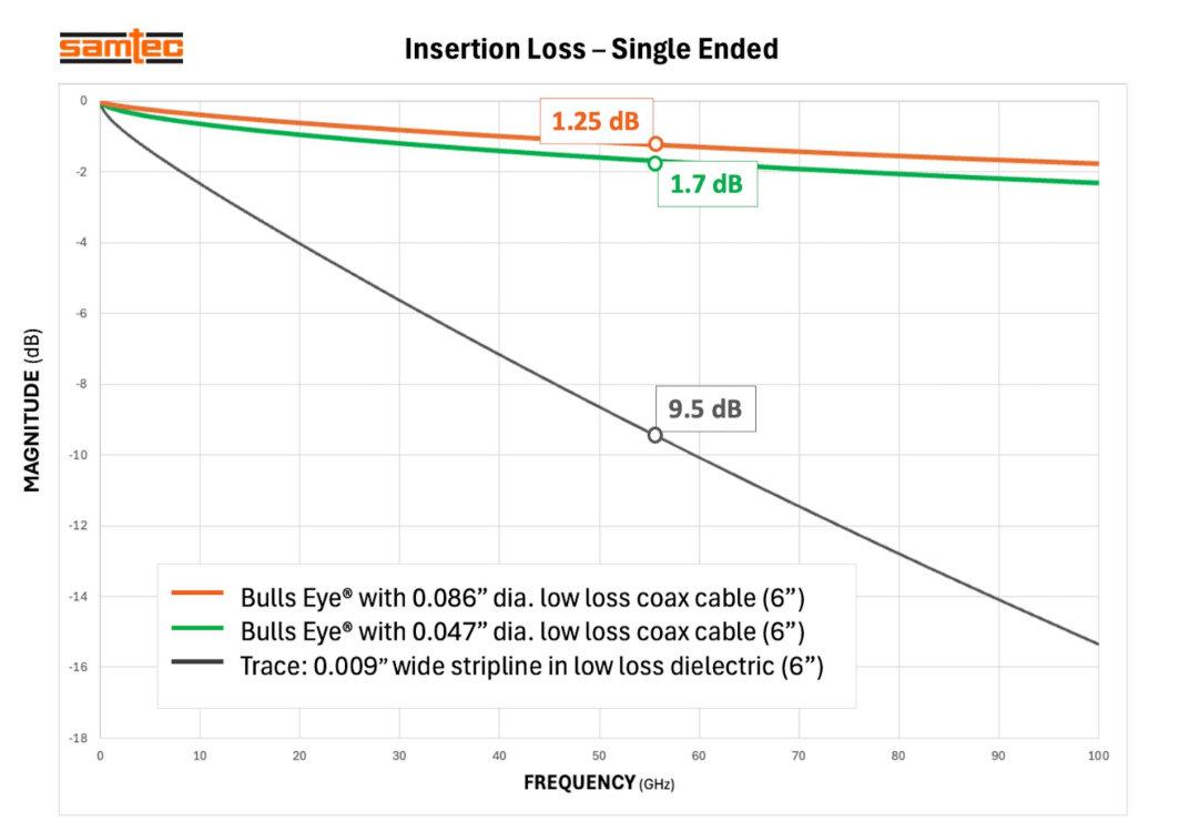 图 3:插入损耗(IL)对比:6 英寸迹线与采用0.047英寸及0.086英寸线缆的成组线缆连接器的损耗表现