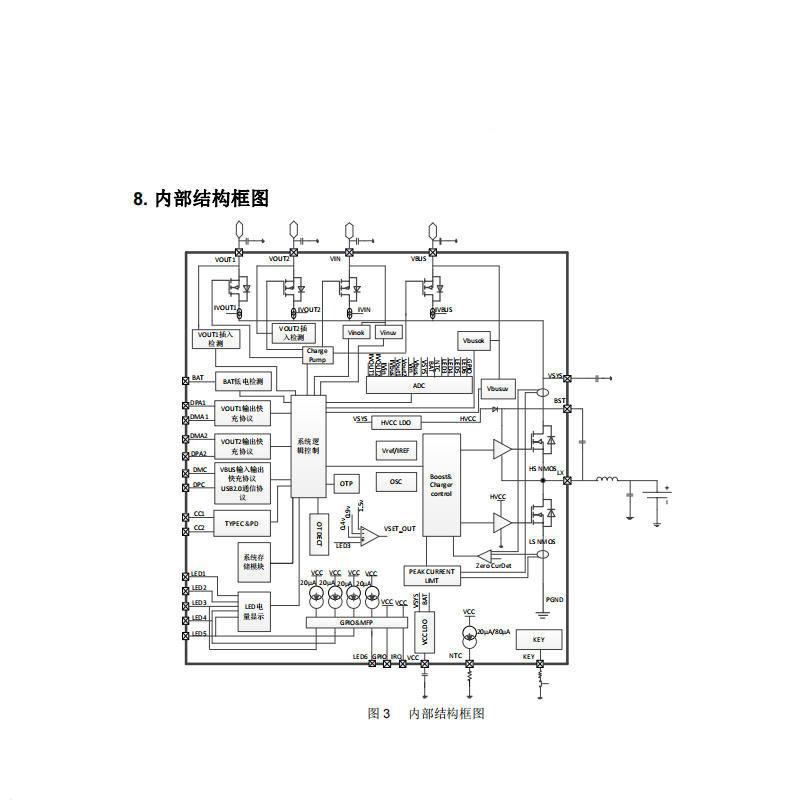 充电策略上,芯片支持充电限制电压随时间动态下降,提供50mV/100mV/150mV/200mV四档调节,延长电池循环使用寿命。同时内置欠压/过压禁用、充放电温度NTC保护等多重机制,当电压或温度超出安全范围时自动切断电源。芯片支持固件在线更新,便于适配未来快充协议扩展。
