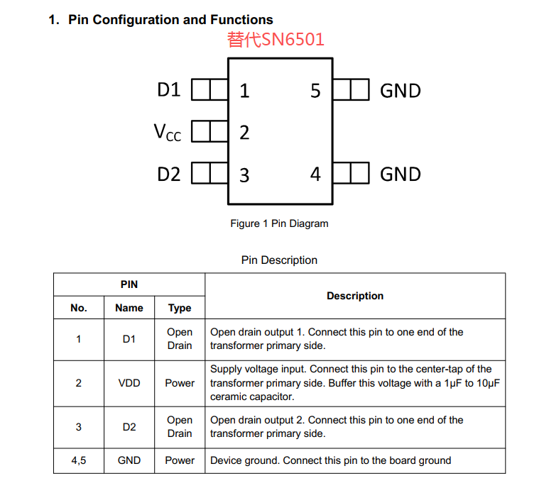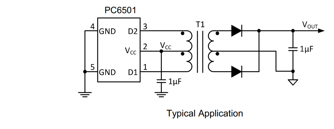 PC6501 是一款低电磁干扰(EMI)推挽式变压器驱动器,专为隔离接口应用中的小型化、隔离电源设计。该器件由 2.7-V 或 5-V 直流电源供电,用于驱动低轮廓中心抽头变压器的初级绕组。次级绕组可根据变压器匝数比提供任何隔离电压。PC6501 由振荡器和随后的门极驱动电路组成,后者提供互补输出信号以驱动接地参考 N 沟道功率开关。内部逻辑确保两个开关之间的“先断后通”操作。内部保护功能包括欠压锁定、热关断和输出电流限制。通过控制输出开关电压的斜率以及采用扩频时钟(SSC)技术,实现了低噪声和低 EMI 性能。