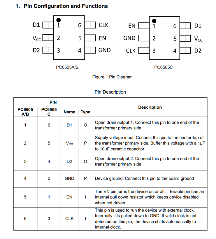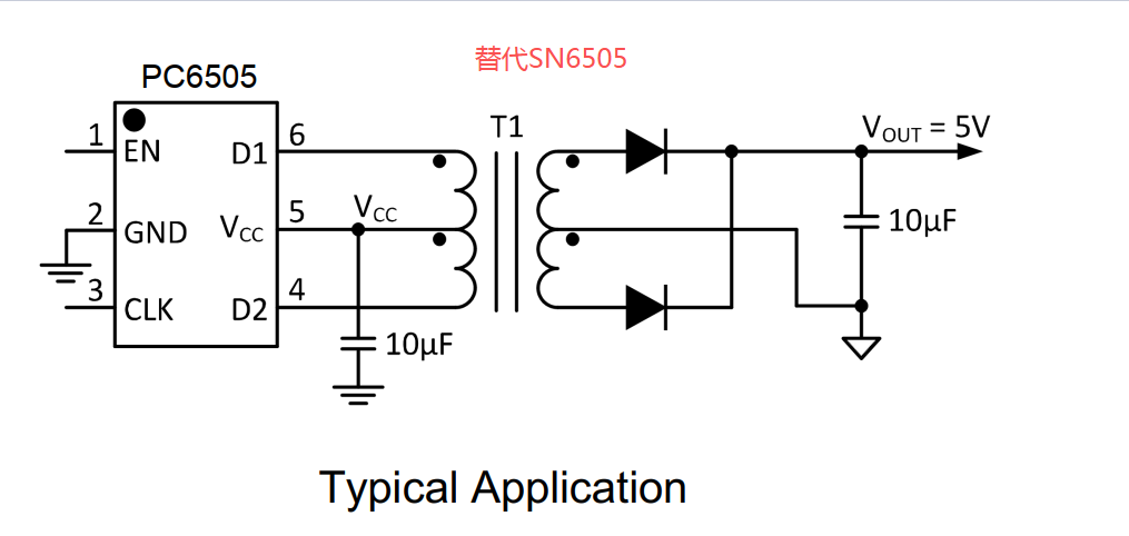 PC6505A/B/C系列是低电磁干扰(EMI)推挽变压器驱动器,专为隔离接口应用中的小型化隔离电源设计。该器件由2.7-V至5-V直流电源供电,驱动低轮廓中心抽头变压器初级绕组。次级绕组可根据变压器匝数比提供任意隔离电压。PC6505A/B/C由振荡器和随后的门极驱动电路组成,用于产生互补输出信号以驱动接地参考N沟道功率开关。内部逻辑确保两个开关之间的先断后通操作。内部保护功能包括欠压锁定、热关断和输出电流限制。通过控制输出开关电压的斜率率以及采用频谱扩展时钟(SSC)技术,实现低噪声和低EMI。