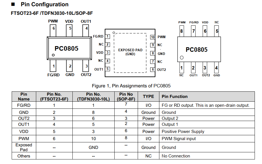 PC0805系列是新一代单相无刷直流电机(BLDC)一体式可编程控制器。与其它产品不同,PC0805系列集成了速度闭环控制模式。与开环速度控制方法相比,速度闭环功能的加入极大地改善了长期应用中因生产偏差或负载变化引起的风扇速度波动问题,显著提高了风扇应用系统的一致性。程序化的软切换功能和负电流抑制功能有效减少了电机旋转过程中对电源的能量回馈,从而显著提升了芯片的静音性能。程序化的软启动功能有效减少了电机启动时的线圈电流过冲,客户可以配置软启动参数,以获得最佳的启动扭矩、声音和安全状态。PC0805集成了可测试性设计(DFT)功能,并按照汽车级封装工艺(-Q产品)进行设计,有效保证了芯片测试和封装的可靠性,目标是在现场实现零PPM(百万分之一)故障率。芯片在整个驱动过程中集成了多种保护功能,包括过压保护、过流保护(OCP)、欠压锁定(UVLO)、转子死锁保护、热关断、限流保护以及线圈能量回馈保护。客户可选择三种封装类型,包括SOP-8F、FTSOT23-6F和DFN3030-10L(TDFN3030-10L)封装。
