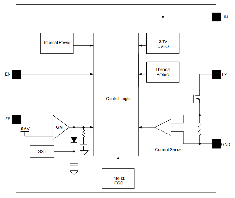 (1)主控级锁定1MHz的固定开关频率(1MHz switching frequency),这种超高频设定的直接收益就是将外围滤波电容和储能电感的尺寸压榨到了极限。