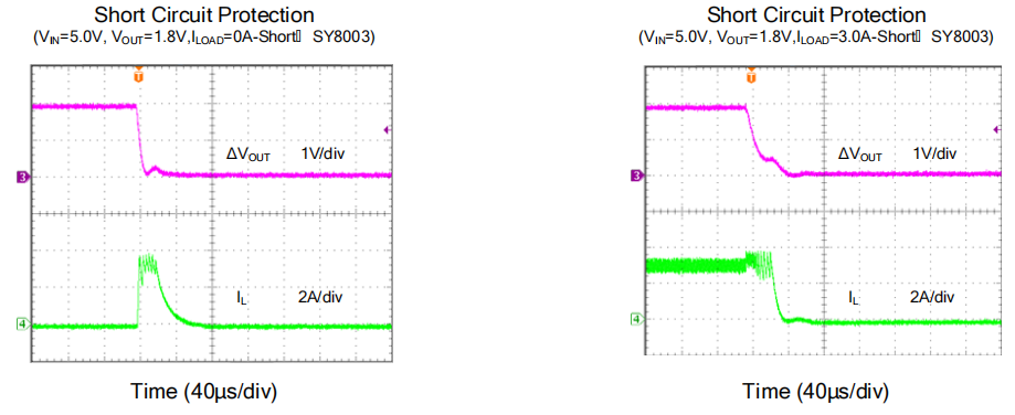 图3:SY8003A短路打嗝模式(Hic-cup)极速保护与恢复波形