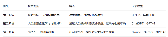 当前主流模型普遍采用“RLHF + 宪法AI”的混合方案,在安全性和成本之间取得平衡。
