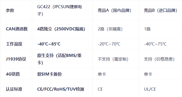 IPCSUN捷宸电子GC422与主流CAN转4G产品对比