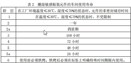 为了衡量元器件的潮湿敏感度,业界制定了一套MSL(Moisture Sensitivity Level)标准,总共分为8个等级。在标准车间下,1级没有时长限制;2级是1年,在特定环境下储存则没有时长限制;2a级储存时间是4周;3级储存时间是7天;4级是3天;5级是2天;5a级是1天;最高的6级是使用前必须进行烘烤,并在规定时间内完成贴装。