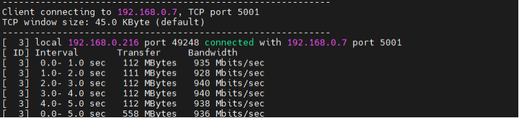 iperf -c 192.168.0.7 -t 5 -i 1