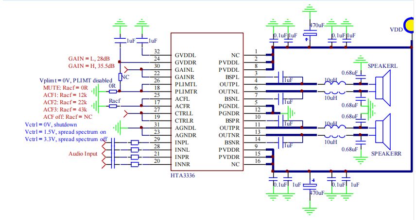 音频设备内部元器件密集,电磁干扰(EMI)是影响音质的重要因素,而传统大功率功放的电感滤波方案又会增加产品体积和成本。HTA3336 内置扩频功能,通过优化振荡器频率的频谱分布,大幅降低电磁干扰,仅需搭配价格低廉、体积小巧的铁氧体磁珠 + 小电容即可满足 EMC 要求,无需复杂的电感滤波电路,实现免电感滤波设计,既降低了 BOM 成本,又为产品的紧凑化、轻量化设计释放更多空间,完美契合条形音箱、无线智能音箱的纤薄机身设计需求。