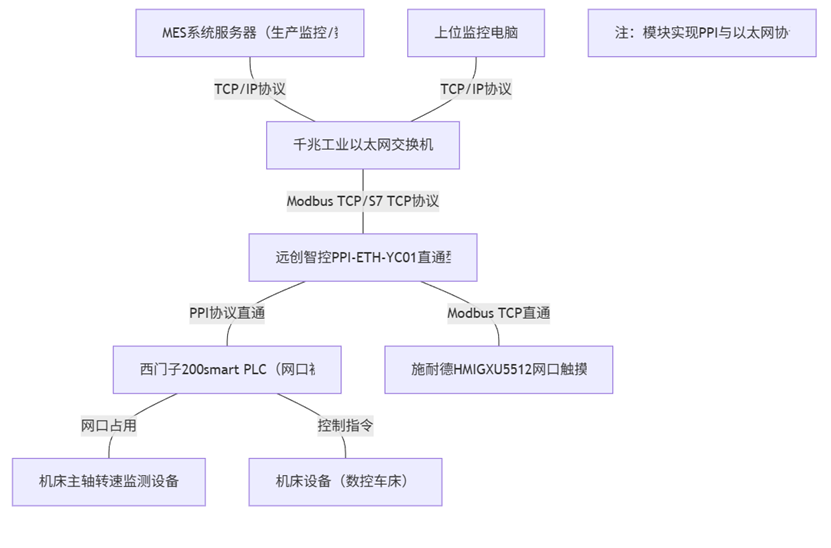 硬件配置:核心硬件包括西门子200smart PLC(CPU SR40,网口被占用,带PPI 9针DP口)、施耐德HMIGXU5512网口触摸屏、远创智控PPI-ETH-YC01直通型以太网模块、千兆工业以太网交换机、MES系统服务器(搭载生产监控与数据追溯系统)、上位监控电脑、机床设备(数控车床)、主轴转速监测设备、专用通讯线缆(PPI通讯线、网线)。