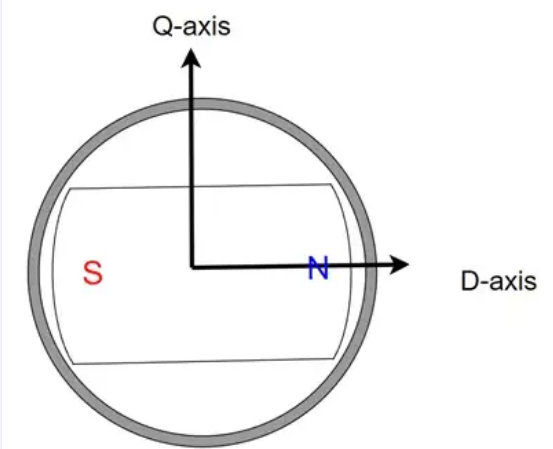 方向关联:Q轴始终超前D轴90°电角度,二者空间正交、互不干涉,共同构成与转子同步旋转的坐标系——D轴方向与转子主磁场(永磁体磁极轴线或励磁磁场方向)完全重合,Q轴方向垂直于转子主磁场,是转矩产生的核心方向。