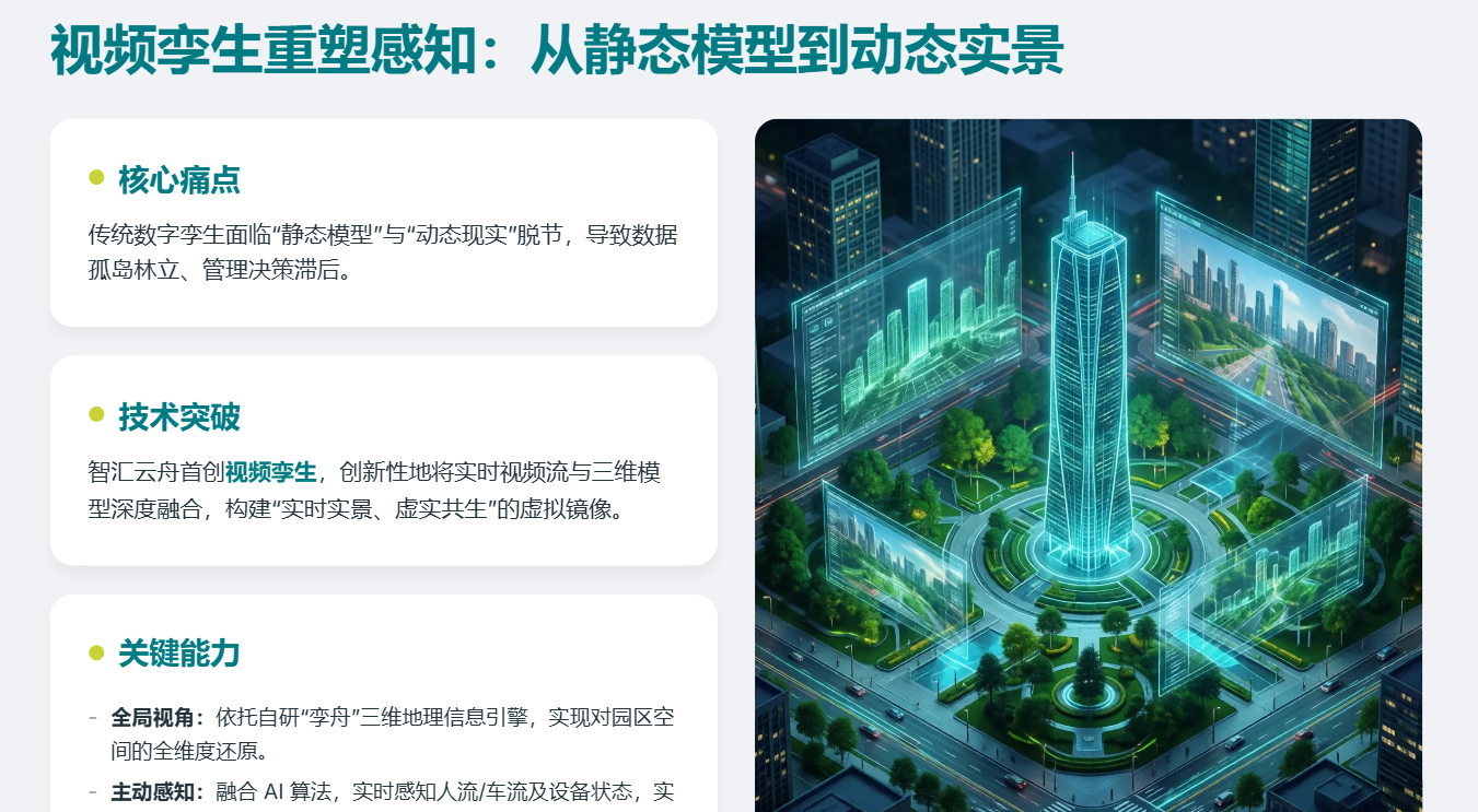 智慧园区的数字化转型,核心在于打破数据孤岛,实现从数据到决策的完整闭环。智汇云舟的解决方案通过深度融合视频孪生技术,构建了一个高效的数智运营体系。
