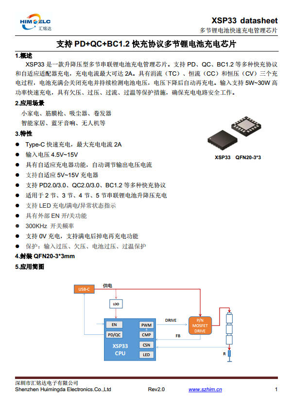 XSP33是专为2-5串锂电池打造的高集成升压/升降压快充管理芯片,内置完整快充协议栈,无需外接诱骗芯片,单芯片实USB‑C/USB‑A快充输入与多串锂电智能快充,为便携储能、工业工具、医疗美容等设备提供极简高效的充电方案。