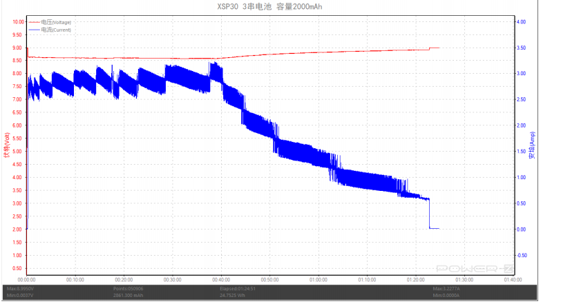 电池容量 2000mAh,3 节串联锂电池,使用 PD 协议充电器输入获取 9V/3A(27W)功率,充电池电流设置 2A,充电时间:1 小时充到 80%,1小时30分钟充满100%