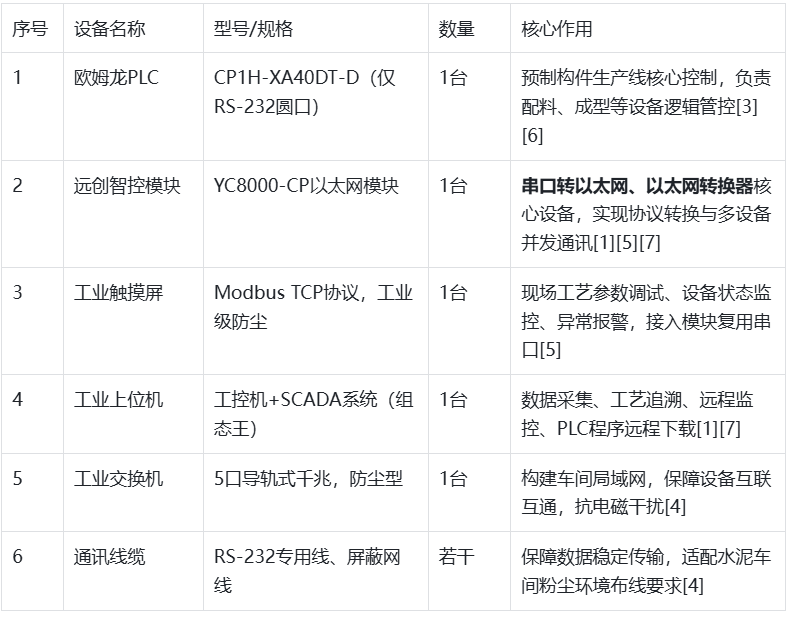 本项目通过引入远创智控YC8000-CP以太网模块,成功破解了欧姆龙CP1H系列无网口PLC在水泥制品预制构件生产中面临的协议不兼容、串口资源匮乏、运维效率低下、质量管控不足等核心痛点。该模块作为关键的串口转以太网、以太网转换器、以太网桥接器设备,凭借即插即用、协议转换高效、多设备并发兼容及工业级高可靠性,实现了PLC与触摸屏、上位机的无缝联网与数据互通,打通了预制构件生产全流程的数据链路,适配双场景生产需求。