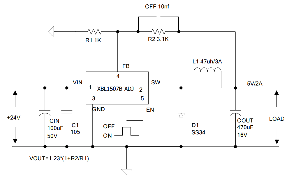 下图为XBL1507B-5.0典型应用电路,输入8V~40V,输出5V/2A,外围仅需电感、电容、二极管和反馈电阻(可调版本)。