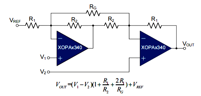 XOPAx340系列器件非常适合用于对电池供电应用中的传感器信号进行调理。上图展示了一款采用XOPAx340运算放大器构建的两路运算放大器仪表放大器。该电路适用于需要在高增益条件下抑制共模噪声的应用场合。参考电压(VREF)由低阻抗源提供。在单电压供电应用中,VREF通常为Vs/2。