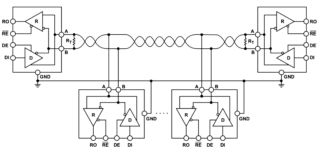 该器件的驱动器输出和接收器输入的组合阻抗小于一个RS485单位负载,一条总线上最多允许挂载多达32个收发器,非常适合复杂的节点网络。