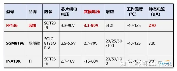 TI的INA19X共模耐压是80V,圣邦微的共模耐压是,SGM8196共模耐压是70V,远翔的FP136是90V,三款器件单从共模耐压来看,都满足基本要求,但实际选型时,不能只看共模耐压够不够,供电耐压同样关键,它往往会影响最终方案能否简化、功耗能否降下来。