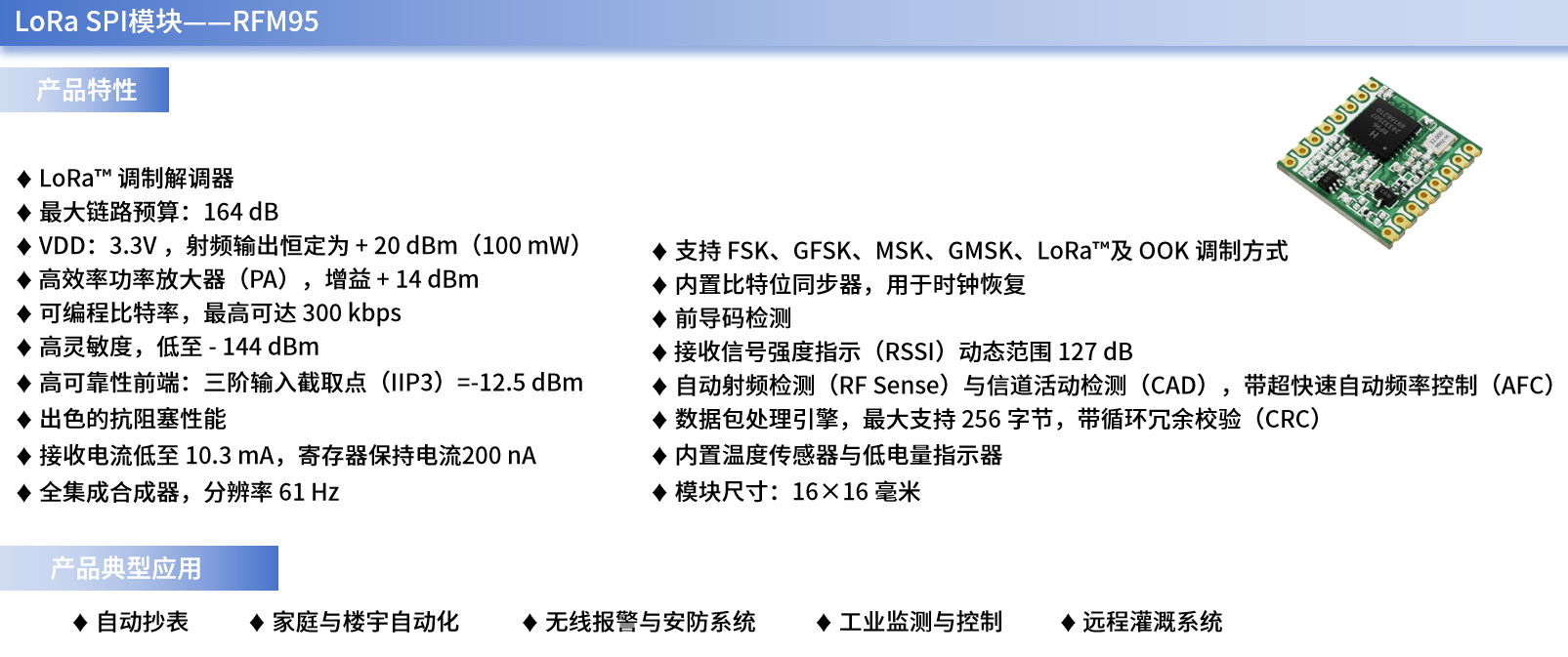 例如,华普微自主研发的RFM95就是一款采用先进数模混合设计,基于独创自适应速率算法,支持多频段、多调制方式(LoRa、(G)FSK、(G)MSK、OOK)的LoRa SPI模块;