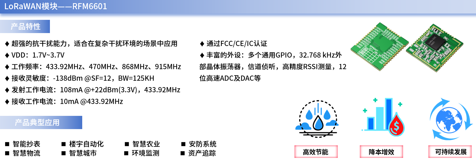 RFM6601是一款支持LoRaWAN节点特性,集成通用MCU、射频收发器、调制解调器及外围器件的高性能LoRaWAN模块;