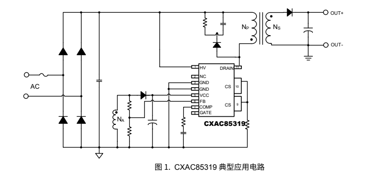 传统反激变换器为了实现稳定的恒压输出,通常需要在次级侧配置TL431和光耦进行反馈,这不仅增加了BOM成本,也占用了宝贵的PCB空间。CXAC85319采用原边反馈(PSR)技术,通过辅助绕组直接采样输出电压,内部1.2V高精度基准源和误差放大器完成闭环调节,完全省去了光耦和次级反馈电路。
