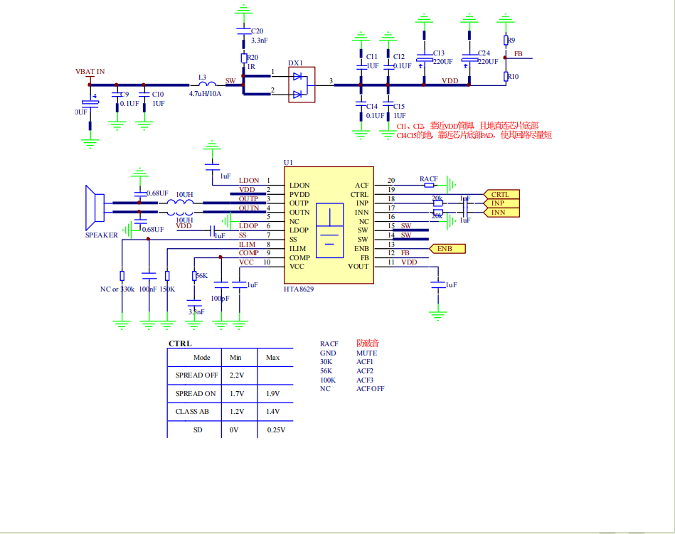 HTA8629具有先进的扩频功能来抑制EMI。如果系统对EMI高度敏感,则可以将升压关闭,并将功放切换到AB类。
