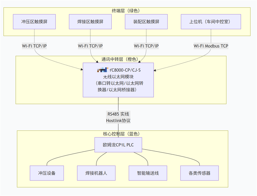 该项目为某汽车零部件生产企业车间智能化升级项目,车间主要生产汽车冲压件、焊接组件等核心零部件,涵盖冲压生产线、机器人焊接工位、装配流水线3大生产环节,部署冲压设备、焊接机器人、智能输送线及位置、压力传感器20余台,核心控制设备采用欧姆龙CP1L系列PLC。该PLC集成RS-232/RS-485串口,默认采用欧姆龙专属Hostlink协议,负责采集生产设备运行参数、零部件加工精度、生产节拍等数据,执行设备启停、参数调节、故障停机等指令,实现零部件生产全流程的精准管控,契合汽车零部件“高精度、高效率”的生产需求。项目核心需求:实现PLC与3个触摸屏、1个上位机的双向稳定通讯,3个触摸屏分别部署于冲压区、焊接区、装配区,供现场操作工调控设备、查看运行状态及加工参数;1台上位机部署于车间中控室,实现全车间生产系统的全局监控、数据统计与远程运维,支撑智能化生产管控。