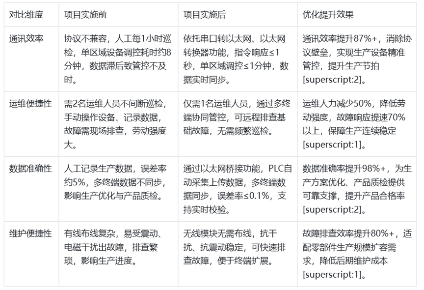 本次汽车零部件生产车间智能化升级项目,通过选用远创智控YC8000-CP/CJ-S无线以太网模块,成功解决了欧姆龙CP1L系列PLC与3个触摸屏、1个上位机的通讯难题,充分发挥模块串口转以太网、以太网转换器、以太网桥接器的核心功能,实现了汽车零部件生产系统的多终端协同管控。项目实施后,通讯效率、数据准确性大幅提升,运维工作量与成本显著降低,杜绝了设备故障漏报、数据错记等问题,实现了零部件精准、高效生产,契合汽车产业智能化转型要求,是汽车零部件领域多终端通讯升级的经典案例。