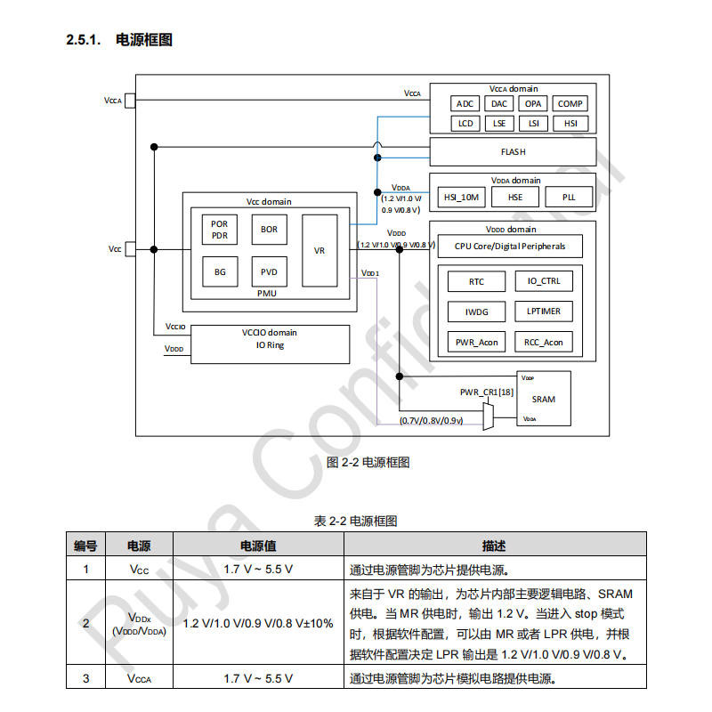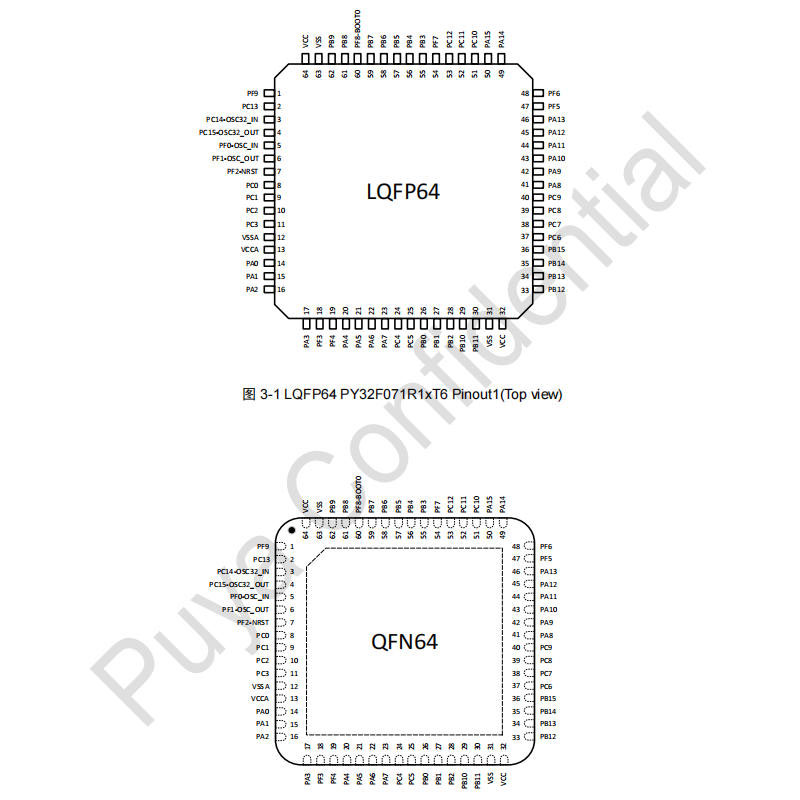 PY32F071 工作电压范围为 1.7–5.5V,可适应不同电源环境。低功耗方面支持 Sleep 和 Stop 模式,以降低系统功耗,适用于便携式设备及物联网终端等对功耗有要求的场景。复位功能包含上电/掉电复位(POR/PDR)、欠压复位(BOR)以及可编程电压检测(PVD),用于应对电压波动等异常情况。