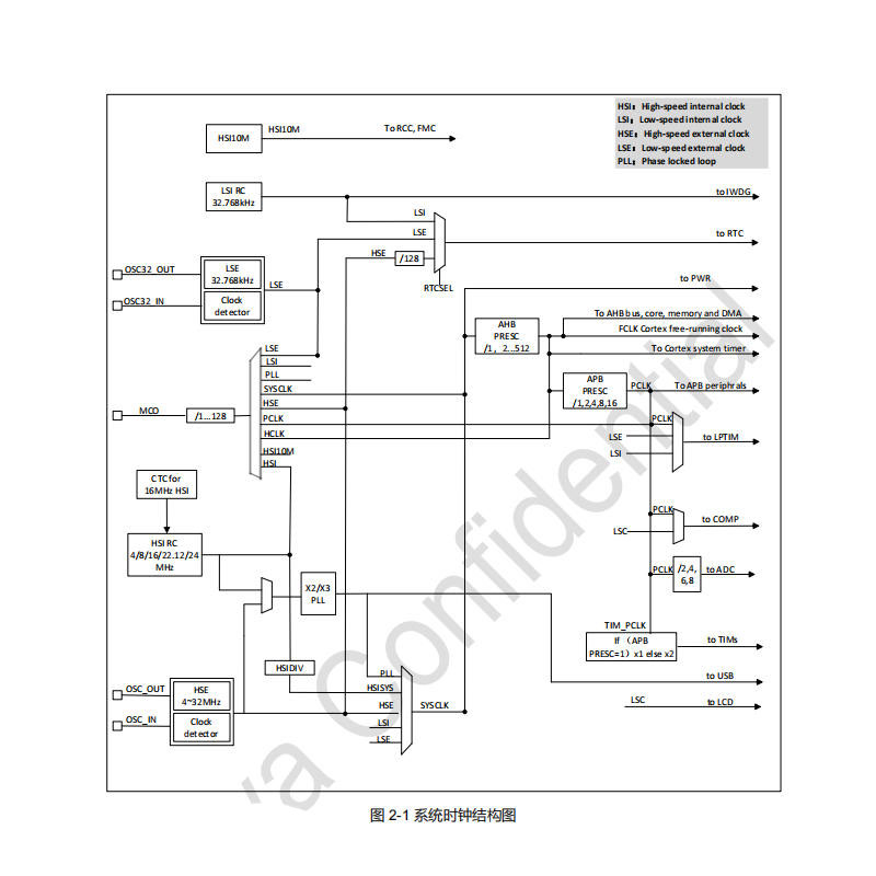 时钟系统方面,内部高速时钟(HSI)提供 4/8/16/22.12/24MHz 多种频率选择,可根据应用场景调整时钟频率,兼顾性能与功耗。内部低速时钟(LSI)频率为 32.768kHz,用于低功耗模式下的定时唤醒。外部高速晶振(HSE)支持 4–32MHz,可为系统提供外部时钟源。外部低速晶振(LSE)频率为 32.768kHz,用于 RTC 等需要计时的场合。此外,PLL 支持对 HSI 或 HSE 进行 2 倍频及 3 倍频,可进一步提升系统时钟频率。