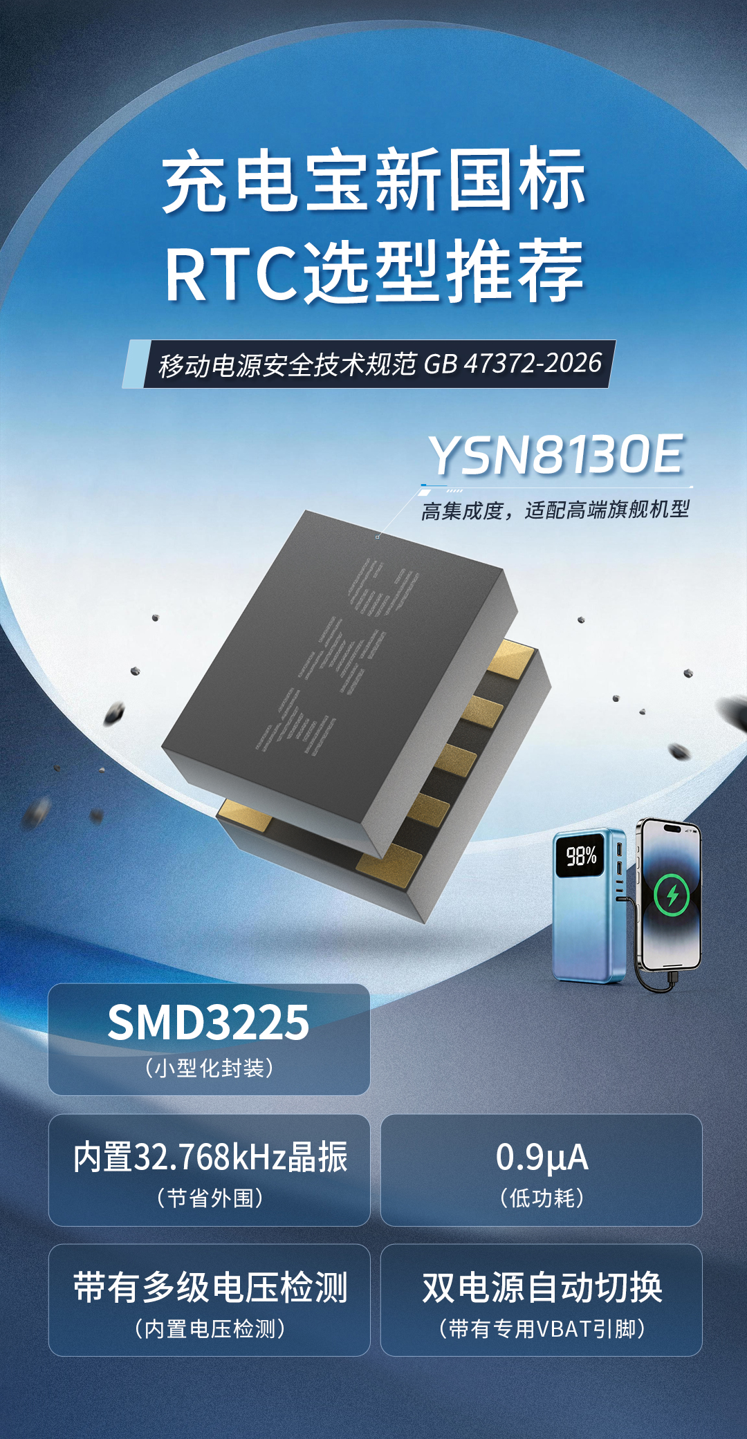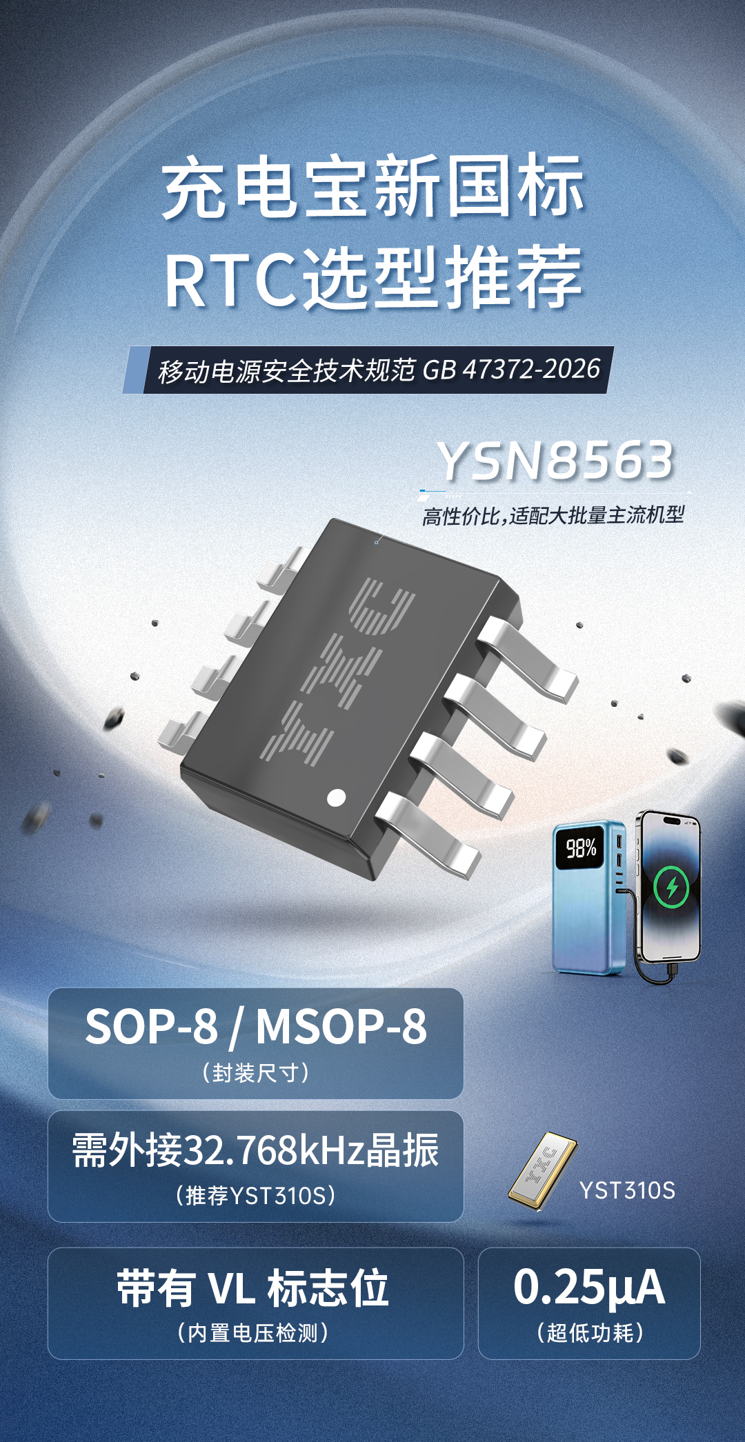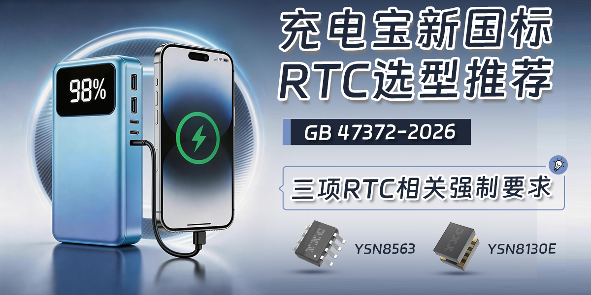要满足新国标三项RTC相关强制要求,要么外接一颗独立低功耗的RTC芯片,要么使用MCU内部RTC搭配备用电源。由于充电宝主控选型多样,导致通用型内部RTC难以兼顾高精度与低功耗,因此,需依赖一颗独立的专用RTC芯片,从根本上解决精度与功耗的双重痛点。外挂YXC扬兴科技YSN8563系列RTC是实现充电宝新国标合规最简单、最可靠、成本最优的解决方案。