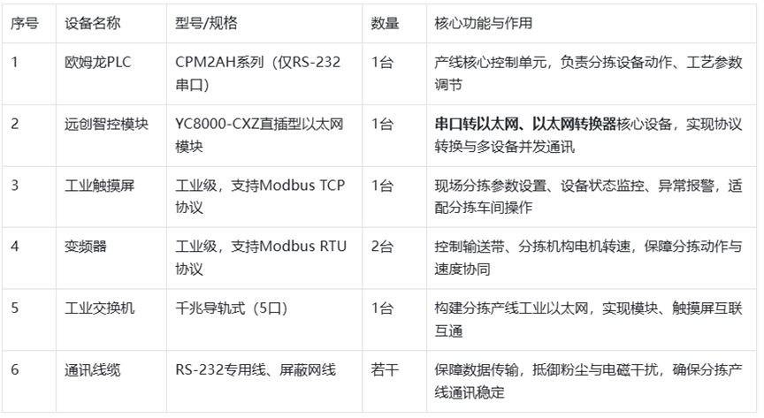 本项目通过引入远创智控YC8000-CXZ直插型以太网模块,成功破解了欧姆龙CPM2AH PLC在分拣产线中面临的协议不兼容、多设备无法并发通讯、抗干扰能力弱、工艺管控粗放等核心痛点。作为关键的串口转以太网、以太网转换器、以太网桥接器设备,该模块凭借其卓越的协议转换能力、多设备并发兼容特性、工业级防护性能及便捷的直插型安装设计,实现了PLC与触摸屏、变频器的无缝通讯,打通了产线数据传输壁垒。