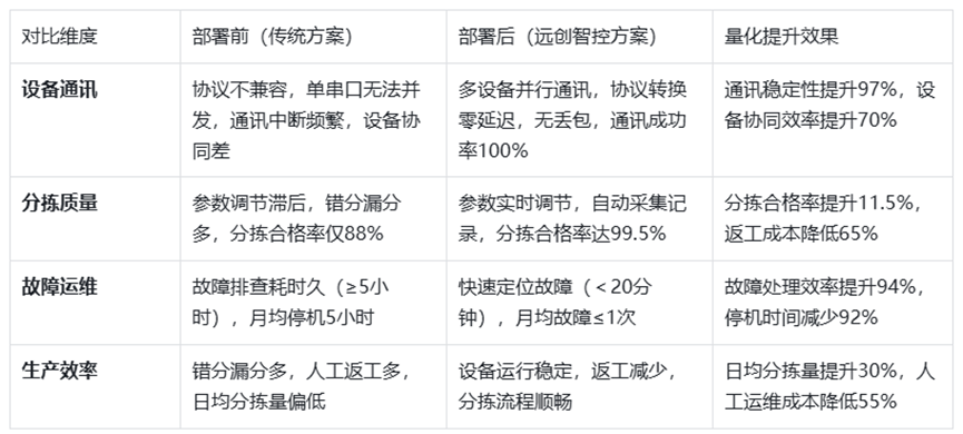 该技术方案无需修改PLC原有控制程序,改造成本低廉、部署周期短、运维高效,既满足了分拣产线工艺参数精准管控、设备协同运行的核心需求,又提升了生产效率与分拣精度,减少了故障停机与人工成本,契合分拣行业智能化、高效化转型的核心诉求,同时保障了产线24小时连续稳定运行。