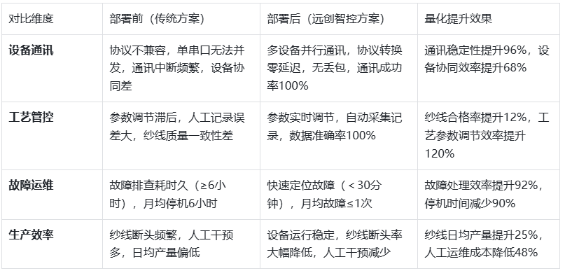 该技术方案无需修改PLC原有控制程序,改造成本低廉、部署周期短、运维高效,既满足了纺织纺纱产线工艺参数精准管控、设备协同运行的核心需求,又提升了生产效率与纱线质量,减少了故障停机与人工成本,契合纺织行业智能化、精细化转型的核心诉求,同时保障了产线24小时连续稳定运行。