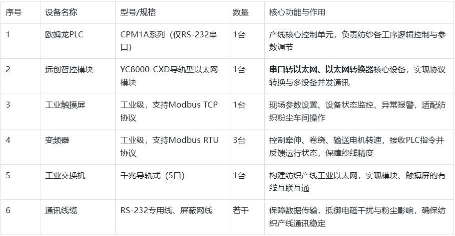 协议不兼容,无法实现多设备协同:欧姆龙CPM1A PLC采用RS-232串口与Modbus RTU/Host Link协议,触摸屏采用Modbus TCP以太网协议,变频器采用Modbus RTU协议,三者通讯协议与传输介质不统一,无法直接互联互通。PLC单一串口无法同时支撑触摸屏与3台变频器的并发通讯,导致各设备各自为战,牵伸速度、卷绕张力等工艺参数调节滞后,频繁出现纱线断头、粗细不均等问题,影响纱线质量与生产效率,不符合纺织行业精细化生产要求。
